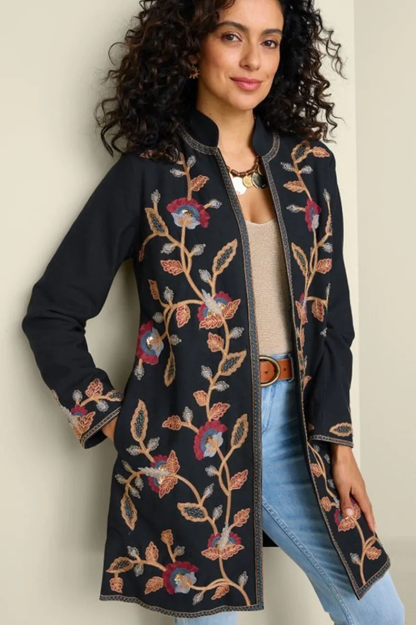 Boasting bountiful special details, this jacket is far from ordinary. From the mandarin collar to the knee-skimming hem bloom artisan-inspired embroidery and beading. Leave it open and flowy or make it more fitted with the hook and eye closure. Pockets for convenience. Lined.