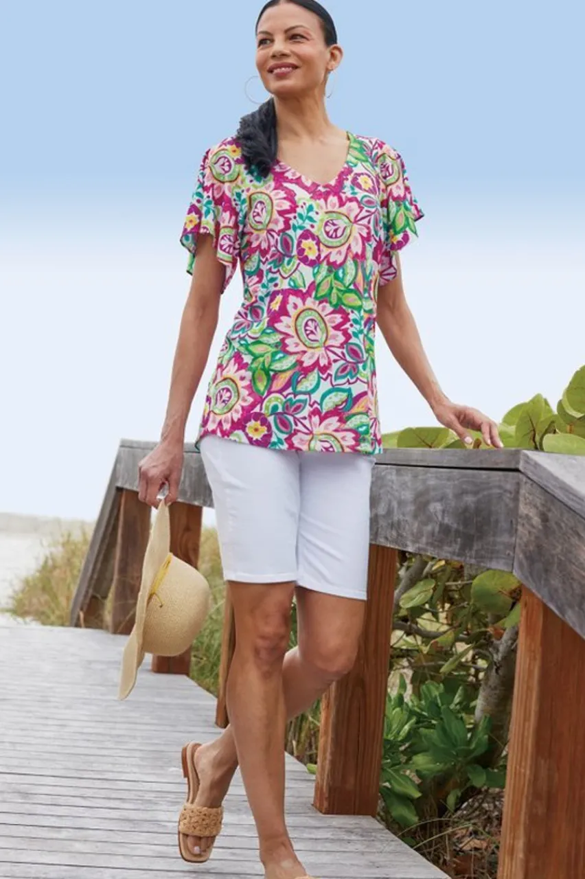Hello sunshine, hello brights! This tunic’s cheerful print adds a pop of color to everyday outfits , and with the soft slub texture of its cotton blend, it feels as good as it looks. Drapey flutter sleeves add a feminine flourish, while the V-neckline makes for a flattering fit, too.