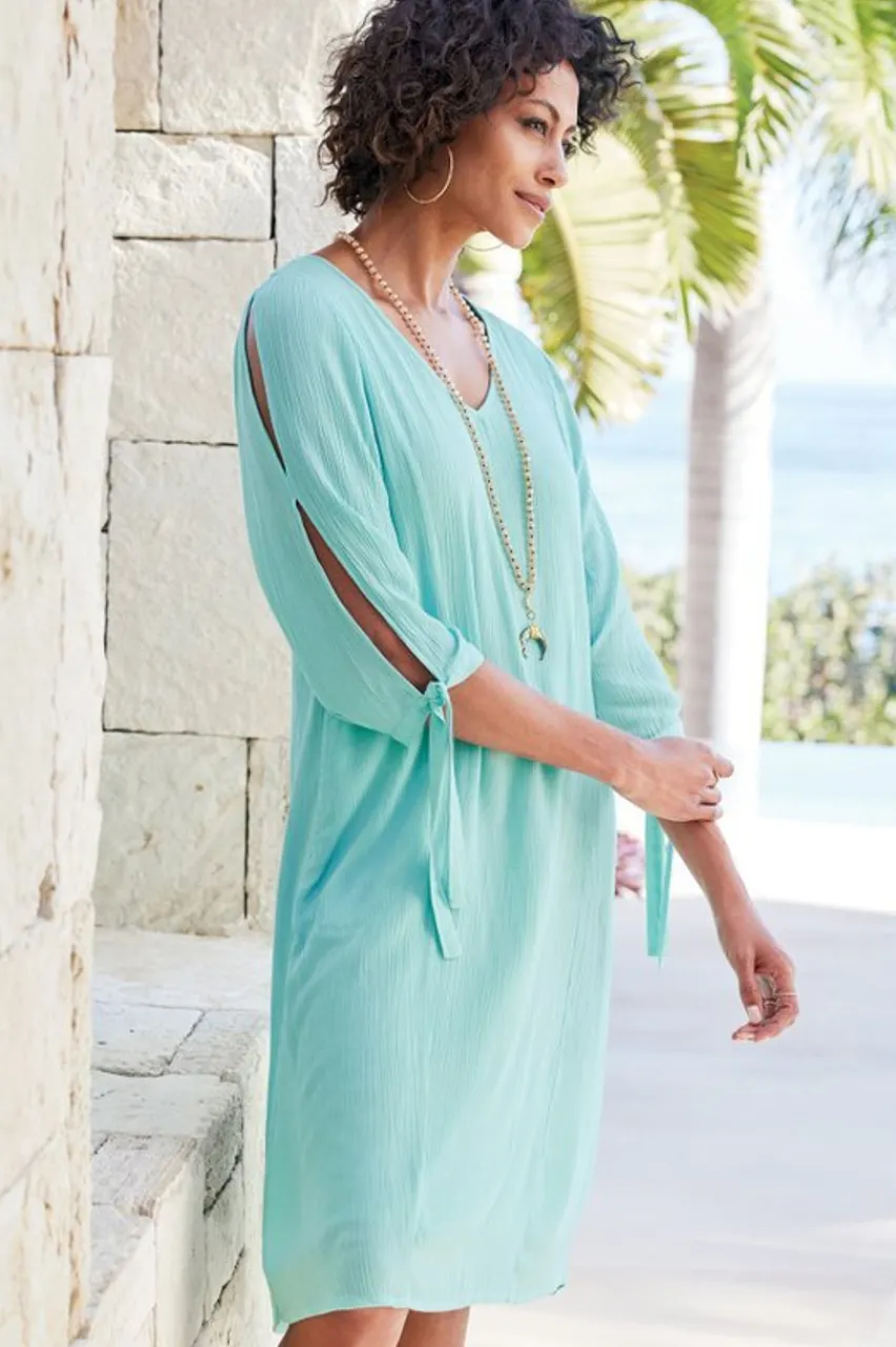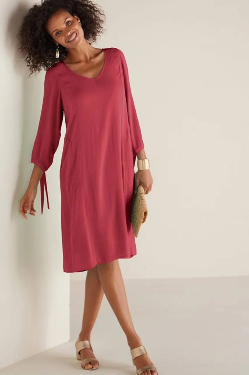 Understated, but elegant, this pretty dress is an easy pick for lunch dates, parties, and celebrations. Slit sleeves finish with ties at the 3/4-length hems. Rounded V-neck with a back keyhole. Full lining.