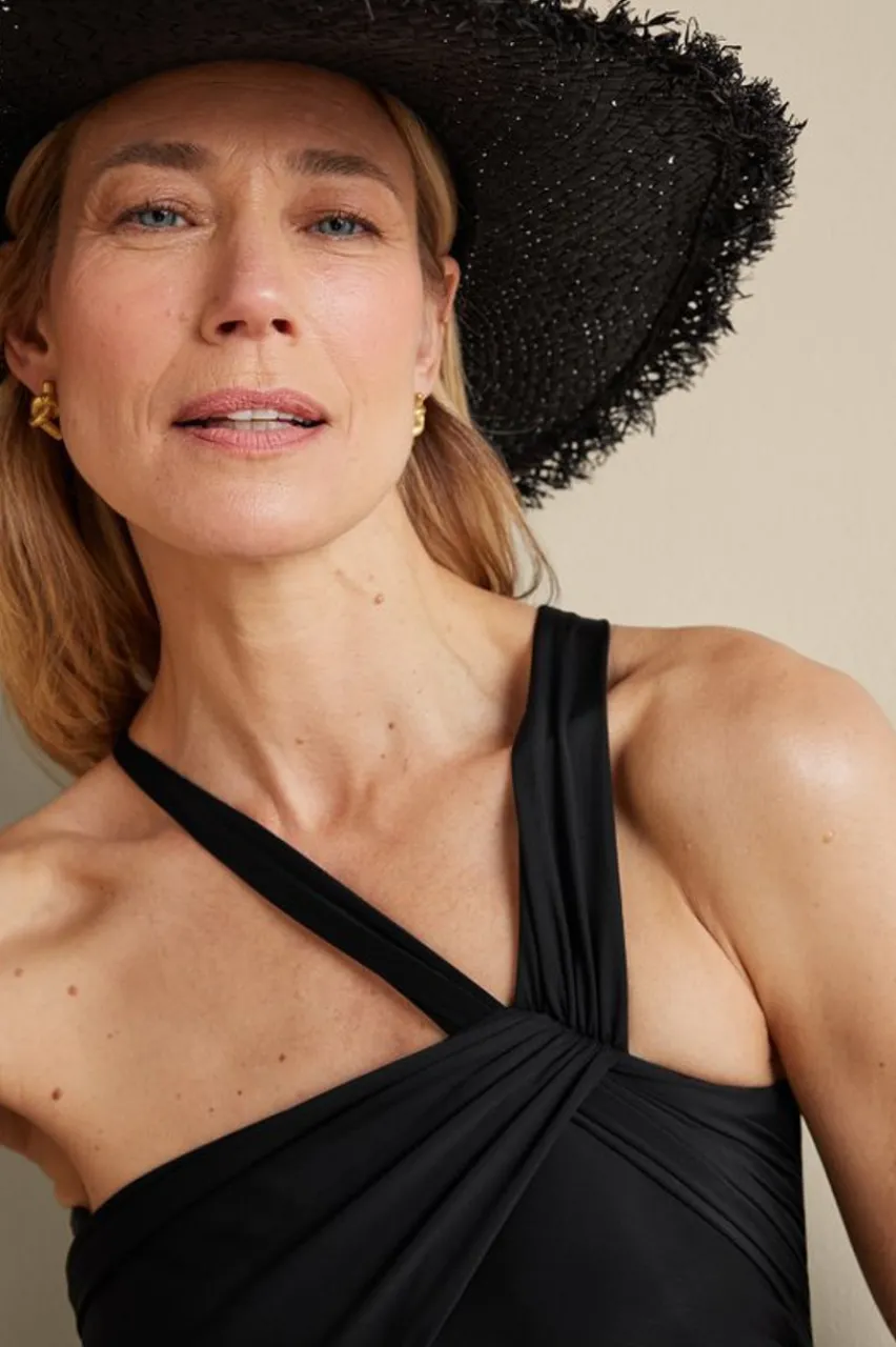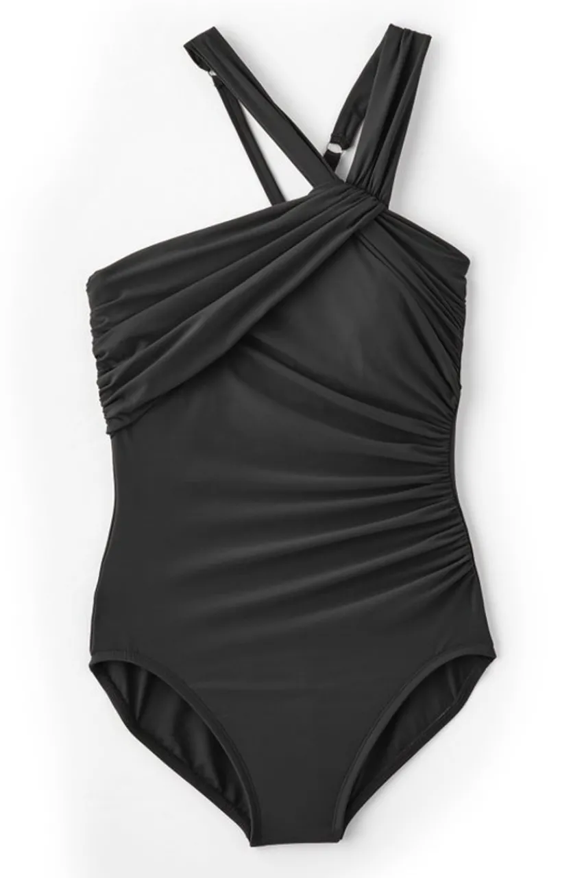 Asymmetrical halter swimsuit brings a new twist to curve control with Miraclesuit’s innovative shapewear technology that will comfortably help you Look 10 lbs. Lighter in 10 Seconds. Goddess-like draping and shirring across the bust and waist are forgiving and flattering. Built-in underwire bra lifts and shapes bustline. Miratex fabric provides allover slimming control. Moderate-cut legs create a lengthening effect. Full, straight back for just the right amount of coverage.If you fall between sizes, we suggest all customers orderthenext sizeup. For example, between size medium and size large should order alargesize.