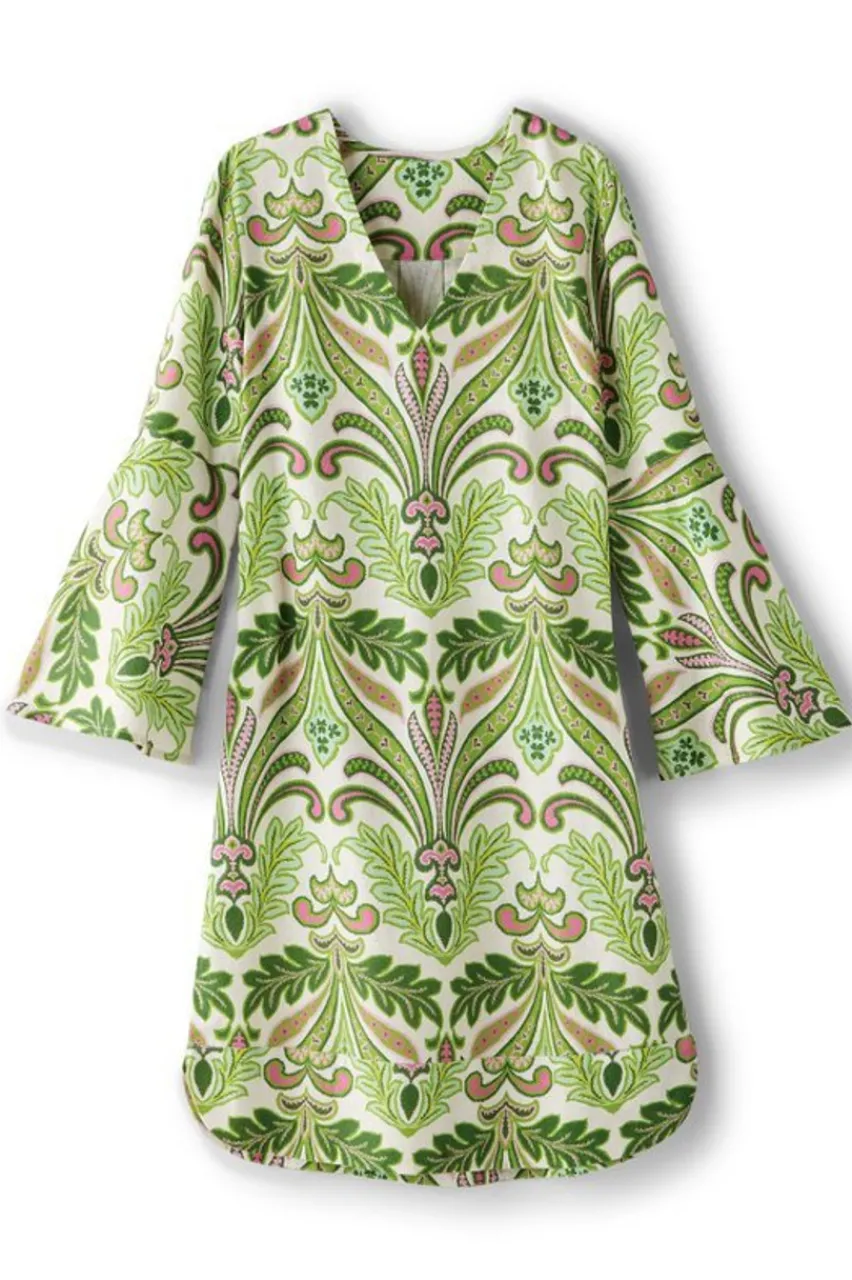 Inspired by our bestselling Milano Dress, this shift style features a V-neck, bracelet-length bell sleeves and a curved hem. The lightweight, drapey linen blend makes it a great choice for warm weather. Just add sandals and a sunhat!