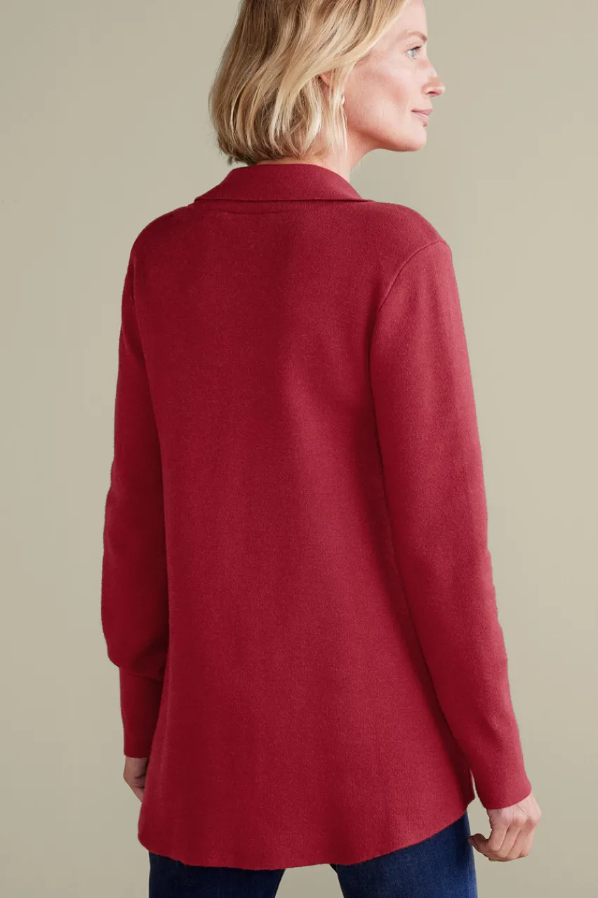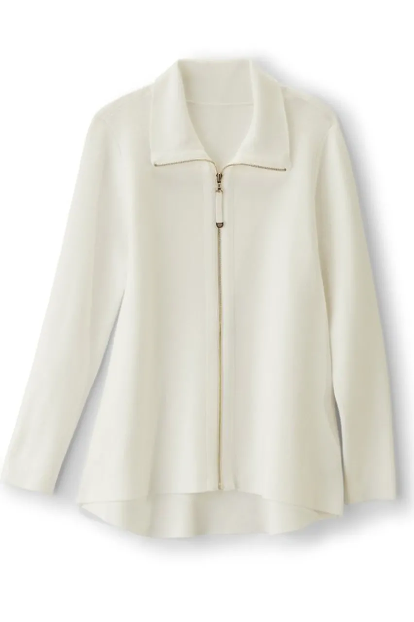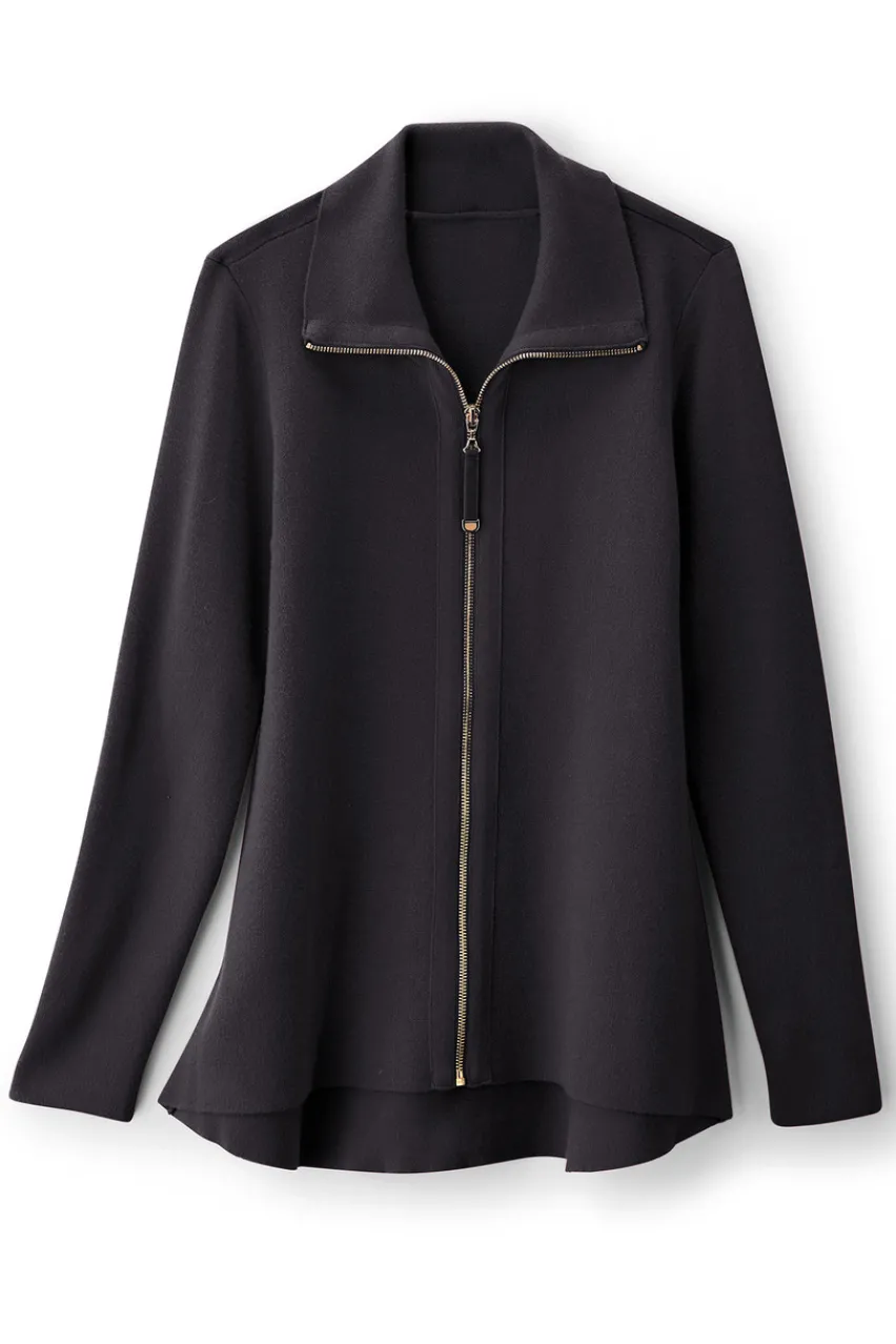 Why we love it: This popular sweater has updated hues, a lovely zip front, and a soft double-face knit for double coziness. It’s designed to wear as a top or great extra layer. Longer in back.