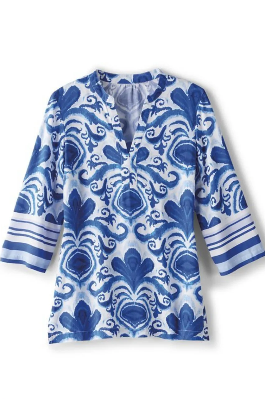 Let’s talk tunics. The longer length makes them great, but this one truly stands out with that dynamic print. The border print at the drapey 3/4-length sleeves is the perfect contrast, too. Can’t get enough of this print? You’re in luck because it’s even in a maxi dress (2GH39).