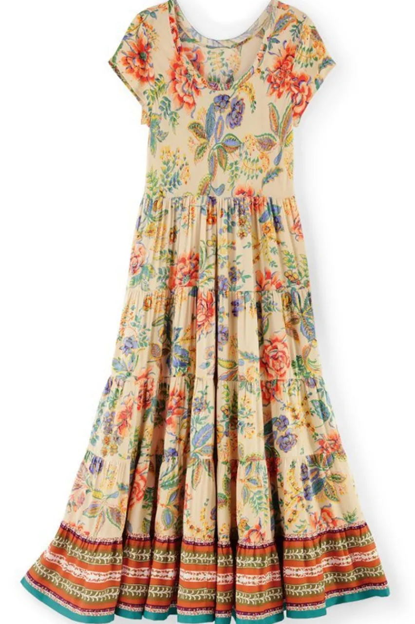 Your soon-to-be favorite dress has all the breezy comfort you need for summer. This supremely feminine, woven style features a quintet of shirred tiers that drape from a modest scoop neck and short sleeves.