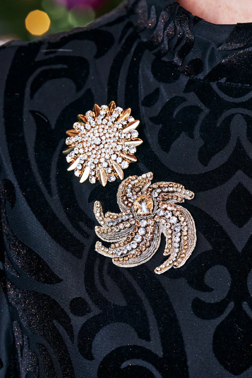Swirls of rhinestones scintillate, effortlessly adding depth and drama to an outfit. An intricately handcrafted and timeless statement piece you’ll treasure forever. Pin back closure.