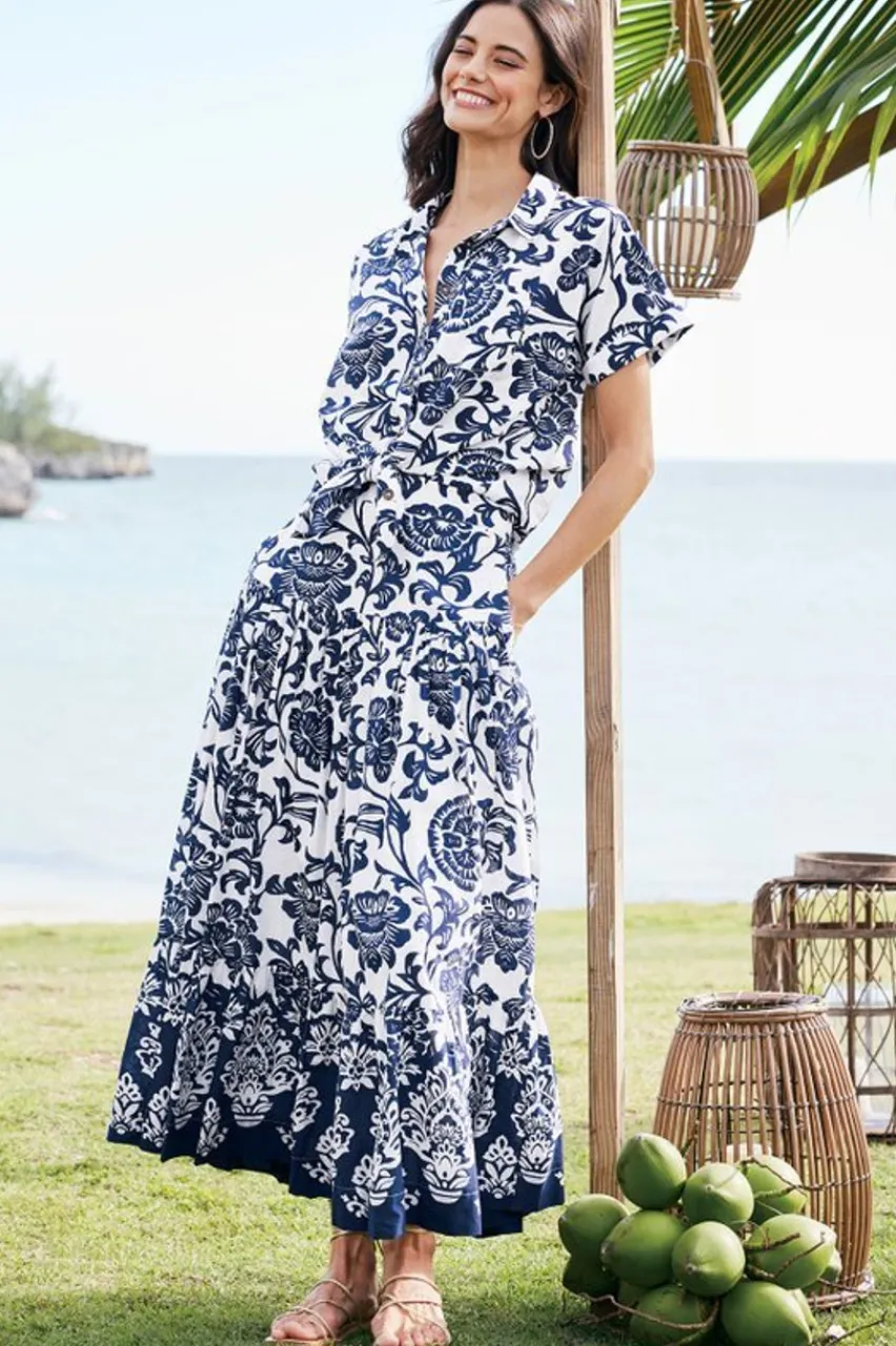 Put it in neutral with this perfectly printed tiered maxi skirt. A soft and comfortable drapey cotton blend, an easy back elastic waistband, plus pockets, too! Dress it up with a blouse and heels or dress it down with a tee and sandals. Also in a matching top to wear as a set! 2GJ14