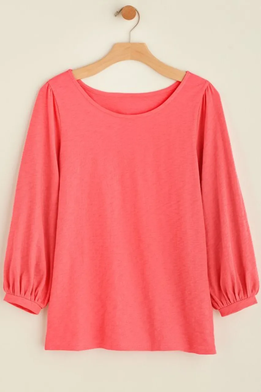 The epitome of easy elegance, the poet top is always so feminine and flattering. This modern style creates great shape from the scoop neck to the shirred shoulders and banded 3/4 sleeves. Shorter length hits just right on the hips. Dress it up or down, with jeans or pants… just add jewels.