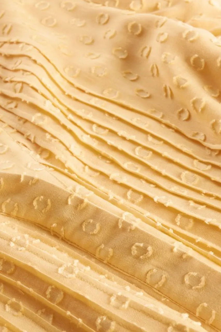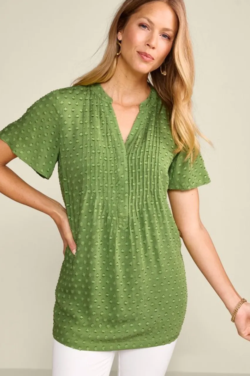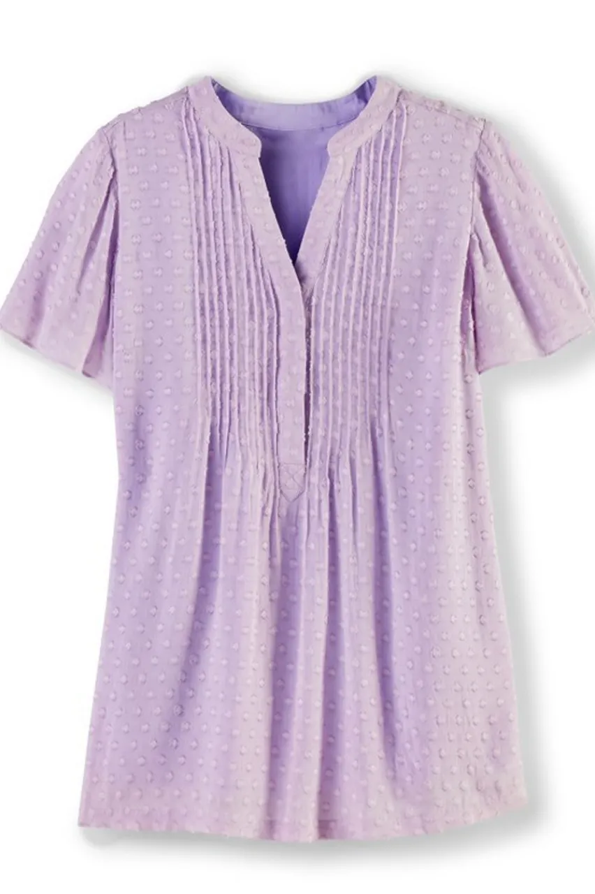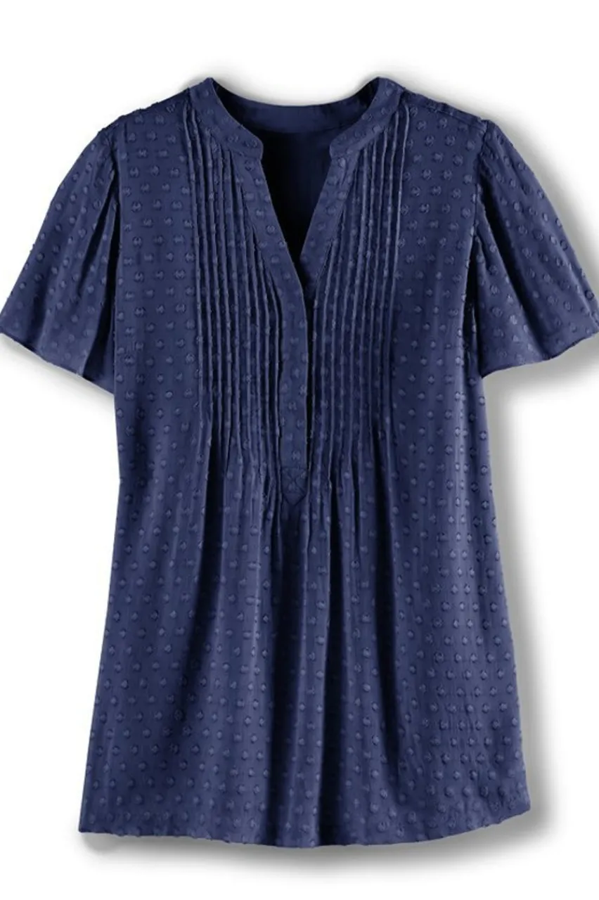 A swingy, flowing top with pleats down the front and back neckline. The shirt has short sleeves and is fully lined.