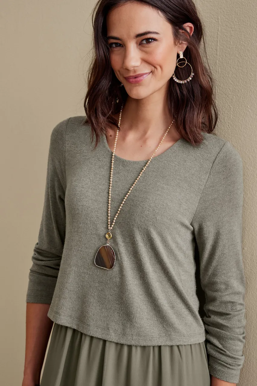 The layered look is always in in for fall and we’ve put a chic twist on the beloved trend with a mix of lush fabrics in one fantastically easy dress. The effect looks like a stylish pairing of separates with a long-sleeve sweater topping a flowy chiffon skirt, but a comfy jersey knit tank dress hidden underneath effortlessly pulls it all together. Hidden elastic waist.