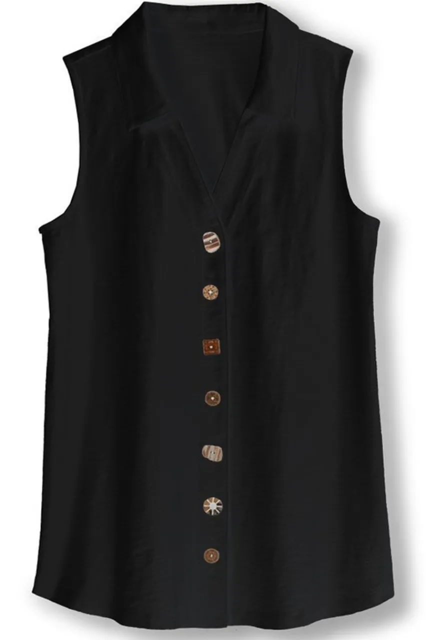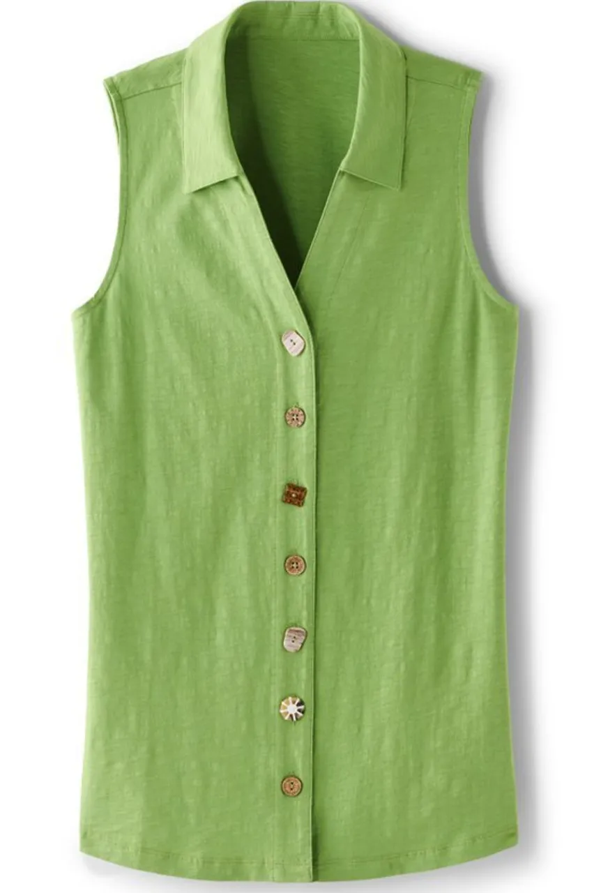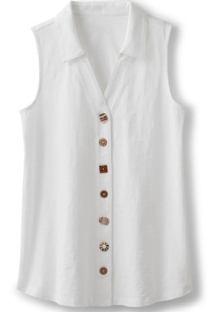 Our beloved Danielle is back and better than ever with an updated silhouette and, of course, the whimsical mix of buttons on the front placket. This flowy, sleeveless tunic is ready for warm weather with a fresh curved hem and high-quality cotton fabric for the comfiest all-day wear.