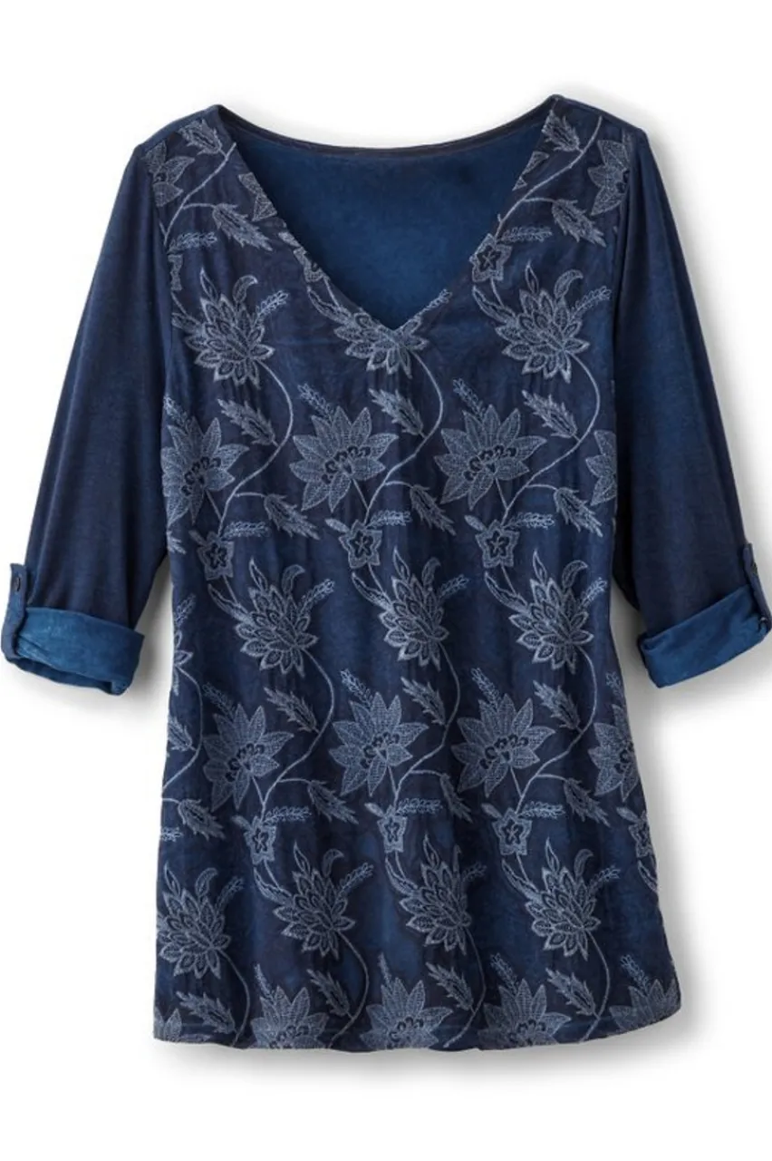 Looks like denim, but it’s knit! If this tunic looks super soft and cozy, it’s because it is; it’s garment dyed to soften both the color and texture. Speaking of texture, the front is full of it a semi-sheer woven georgette overlay featuring placed floral embroidery truly takes this knit to another level. And because it should be versatile, too, we included roll tabs if you’re ever feeling like 3/4 sleeves over long sleeves it’s all up to you!