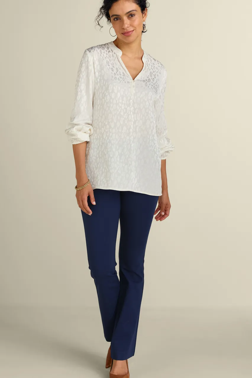 An animal pattern jacquard with subtle sheen? Wild! This partial button placket tunic is a great go-to for dinners out and special events where you’re looking for an alternative to a dress. The flattering drape and elastic cuff long sleeves just add to the elegant ease.