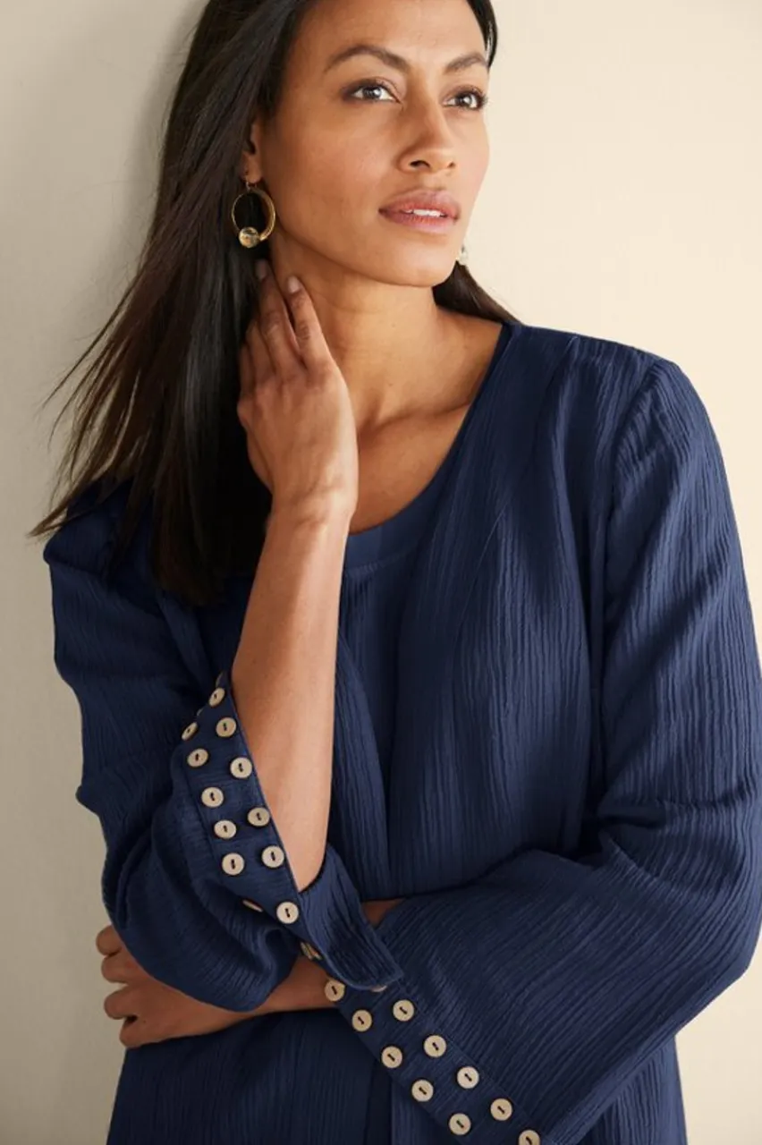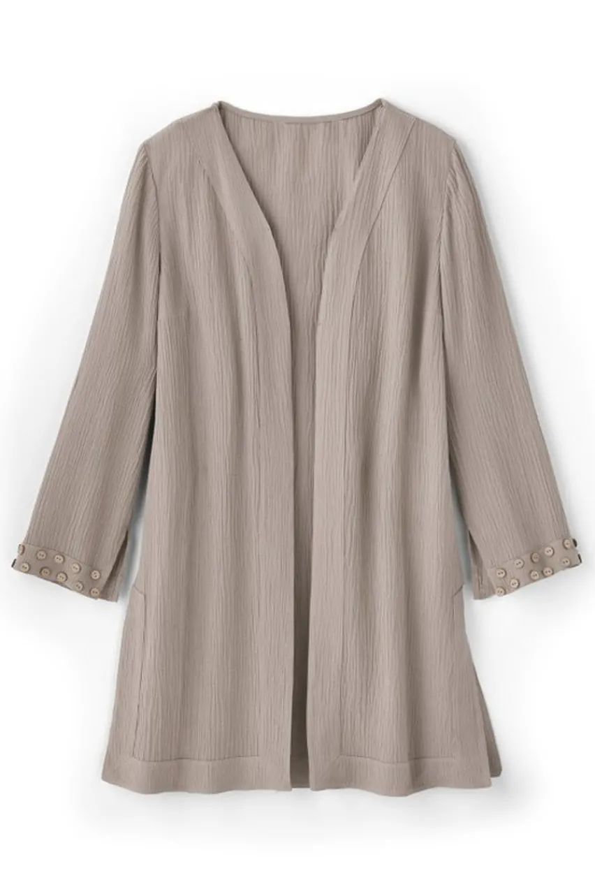 Breathable with a luxe drape, our lightweight Oceo Gauze has a naturally crinkled texture. Mix, match and pack no ironing needed. Open front, side slits and button accents on bracelet-length sleeves. P.S. Also comes in a tank, tunic and wide-leg pants!
