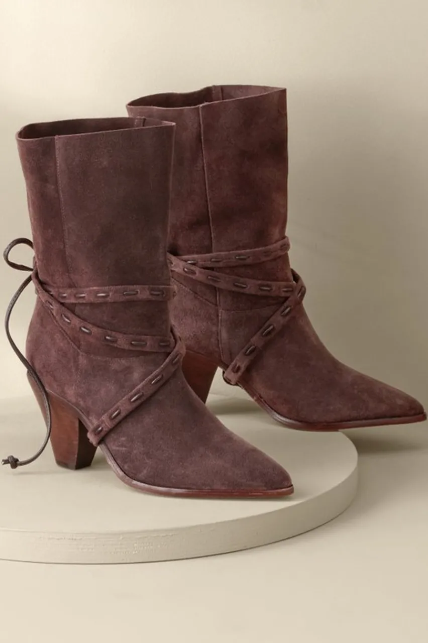 With the classic pointed toe of your favorite cowboy boot, this suede design kicks the style up a notch with a midi height and bands of stitched suede winding around for modern flair. Inside zip. Synthetic lining. Leather sole. Stacked wood heel.