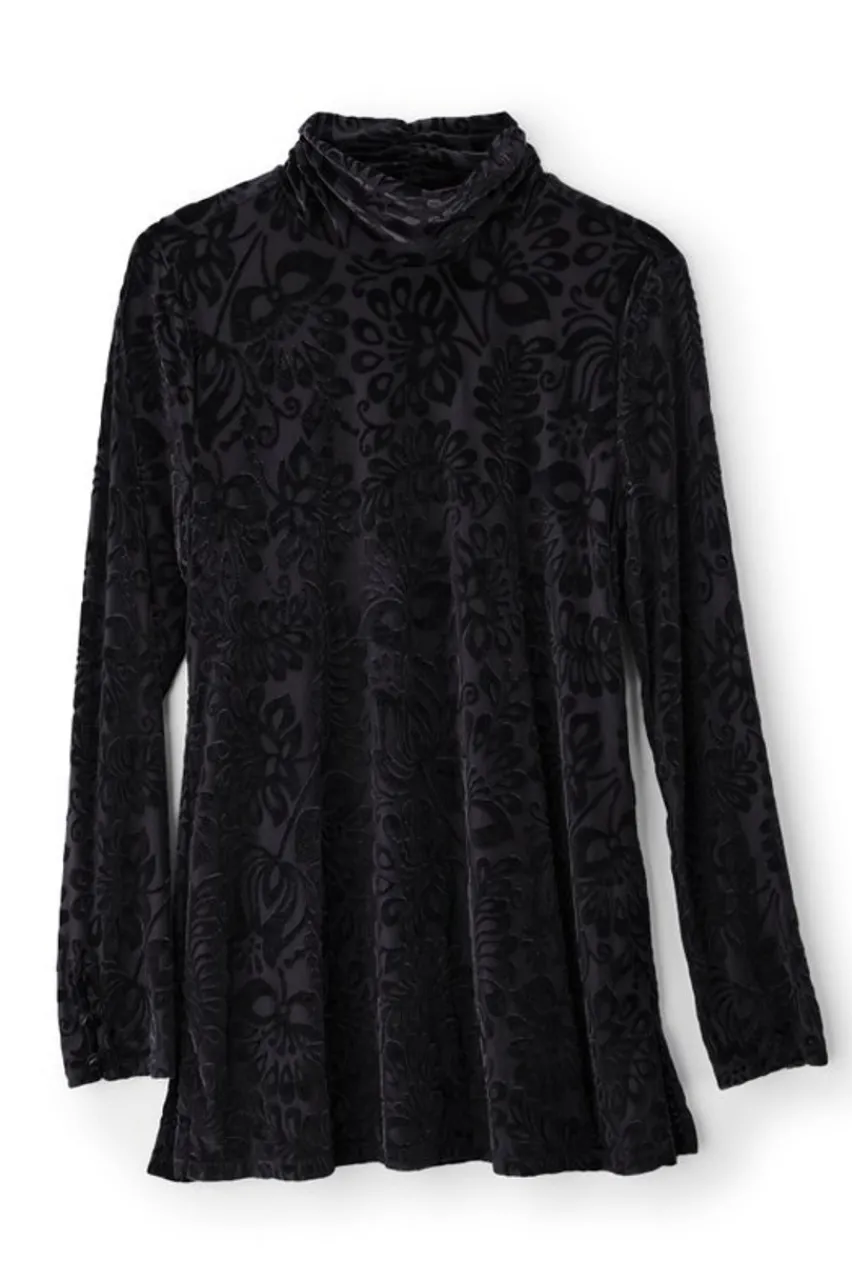 Gorgeous velvet burnout, in a rich shades, puts your must-have turtleneck in a celebratory mood just right for the season’s best parties. Fully lined body with lightly sheer, buttoned sleeves. Side slits, back neck ruching.