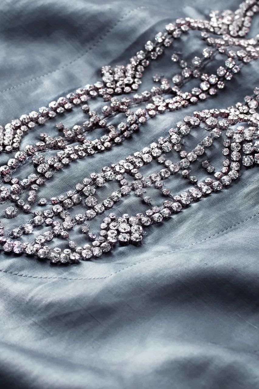 Bejeweled embellishments adorn the front placket, stand collar, and cuffs of this elevated tunic.