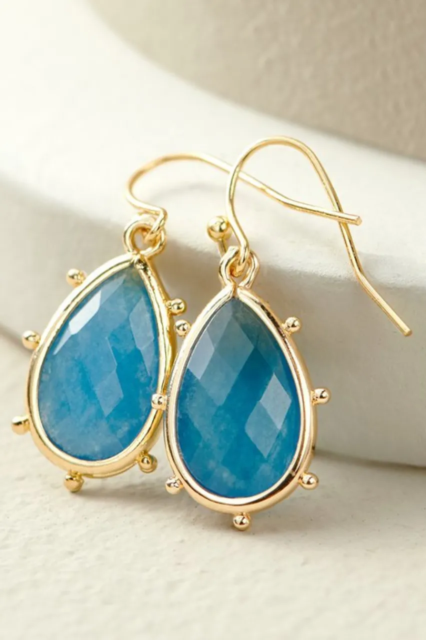 You’ll go wild for these gemstone teardrops. The studded silhouette frames beautiful Malaysian jade you can wear with your best blues or tiger’s eye that pairs with almost anything, even neutrals. French wire backing. Natural tigers eye or blue Malyasian jade stone/gold-plated brass.