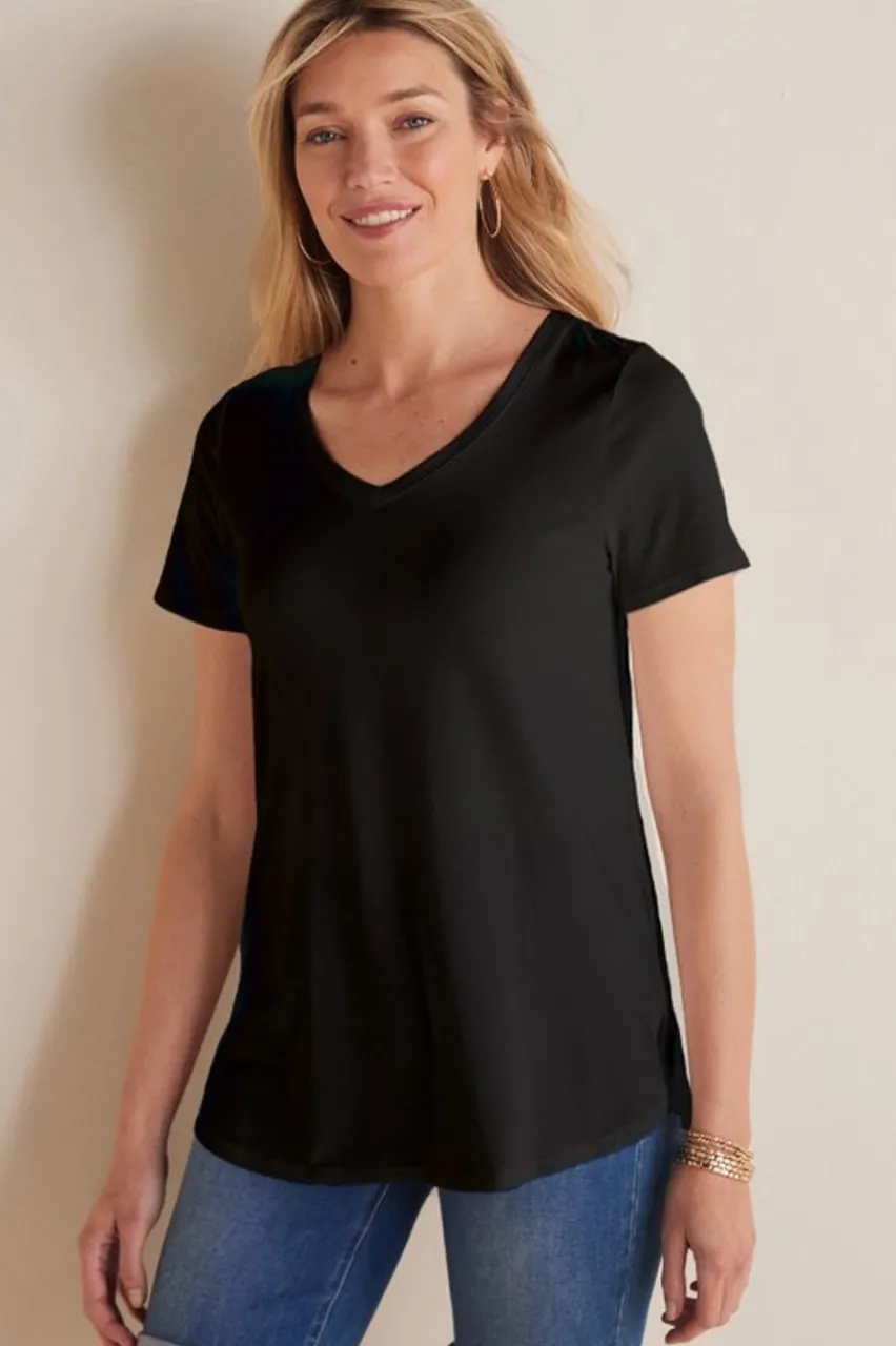 What sets this must-have cotton-blend tee apart are the styling details that make it a favorite for every day. The longer tunic length dips and curves in the back to boost the wearability with leggings, jeans, anything! It’s made from the softest Pima cotton with just the right hint of stretch so the shape always stays fresh. V-neck, short sleeves.