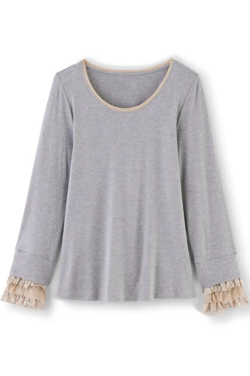 Lavish, ruffled lace cuffs bring a flair of romance to the classic knit top. With a georgette trimmed neckline, this drapey, lightweight design looks so chic with jeans and sneakers, but you’ll also love to wear it when you’re curled up in leggings at home.