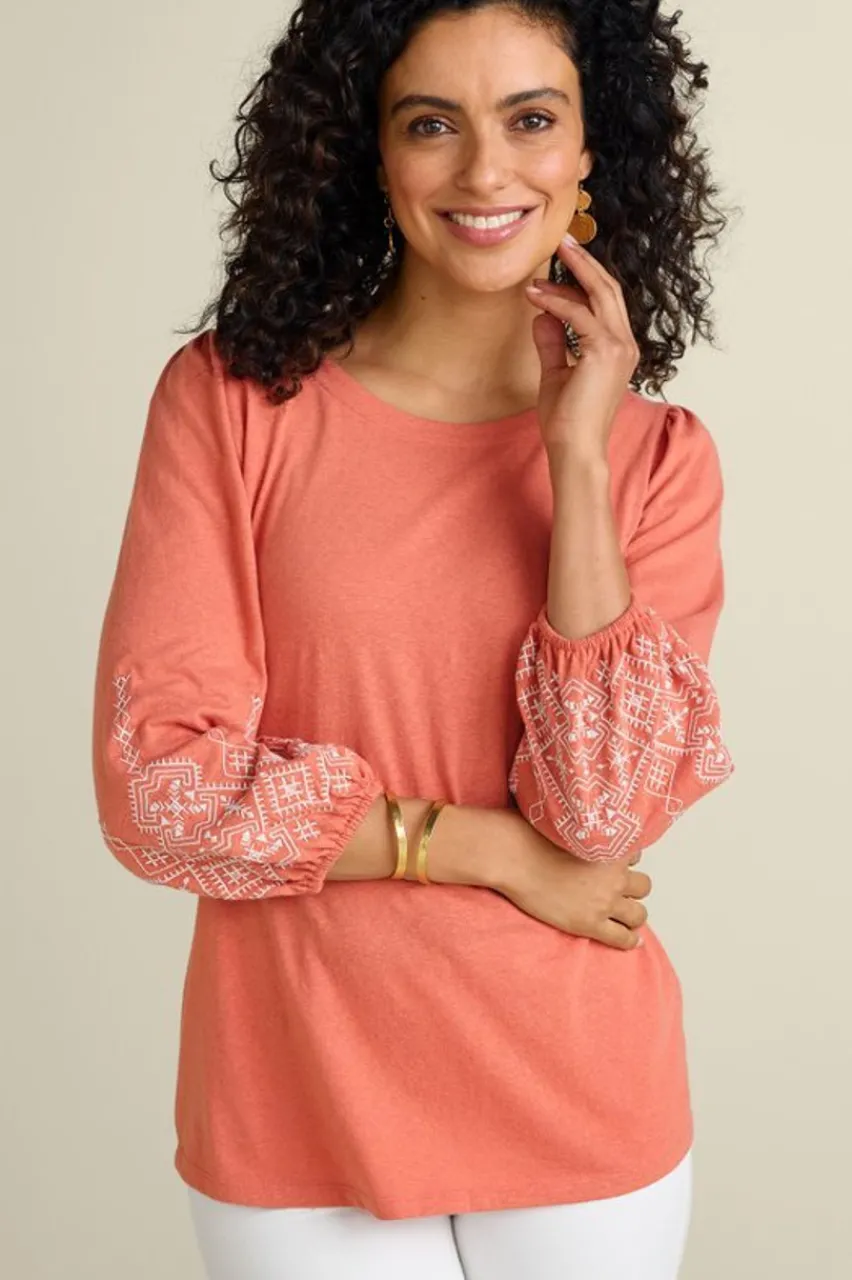 Everyday ease meets delightful detail on this stitch-perfect scoop neck. Intricate embroidery gives 3/4-length puff sleeves an artisanal flourish, while subtle shirring at the shoulders creates a frilly, feminine shape. Styled with jeans or a skirt, it’s ready to go from lunch dates to errands or days about town.