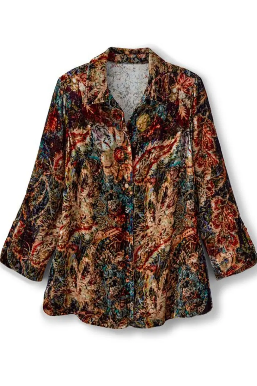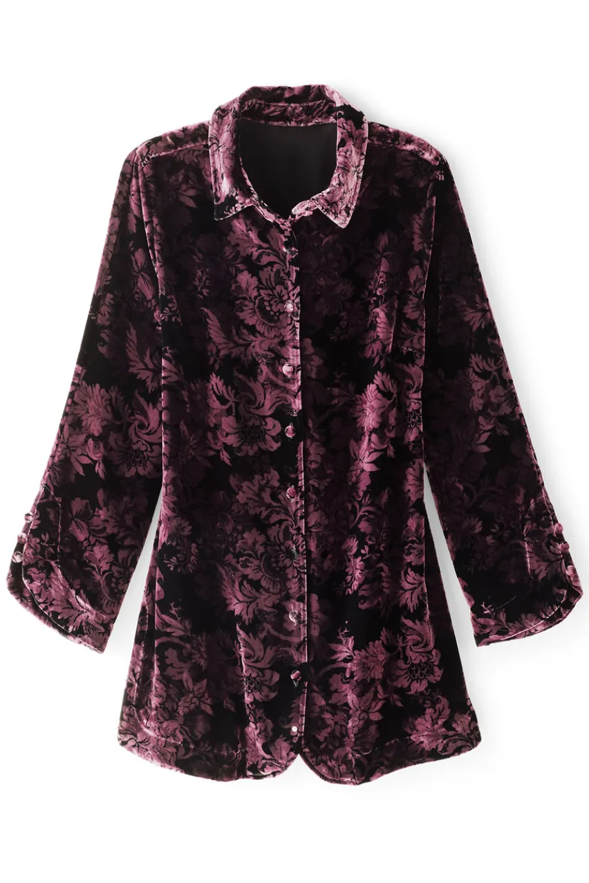 Lavish the hours in our lush and silky velvet blouson, with curved openings at full front placket and button-detailed 3/4 sleeve openings, bust darts, and side-slit hem.
