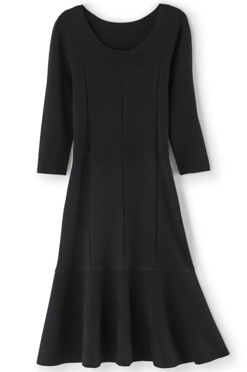 The Little Black Dress your winter wardrobe should never be without. The sweater knit smooths. The strategic seaming shapes. The peplum skirt sways. The mastery is in the stitchwork on this sophisticated, knee-length number.