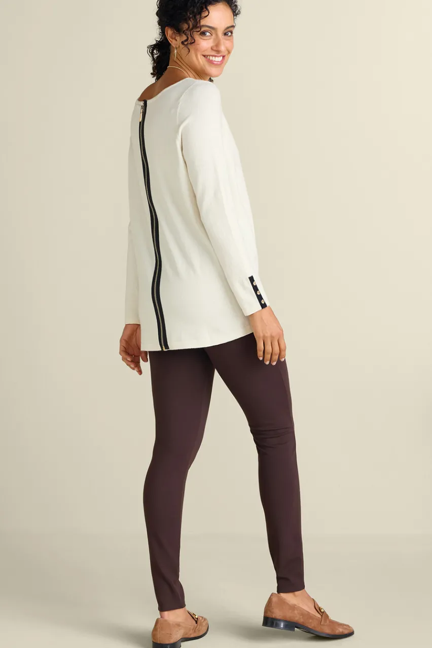 It’s all in the details. This easy scoop neck has buttons on the long sleeves and an oversized, decorative zipper at the center back. You’ll adore its supreme softness and agree that details do make a difference.