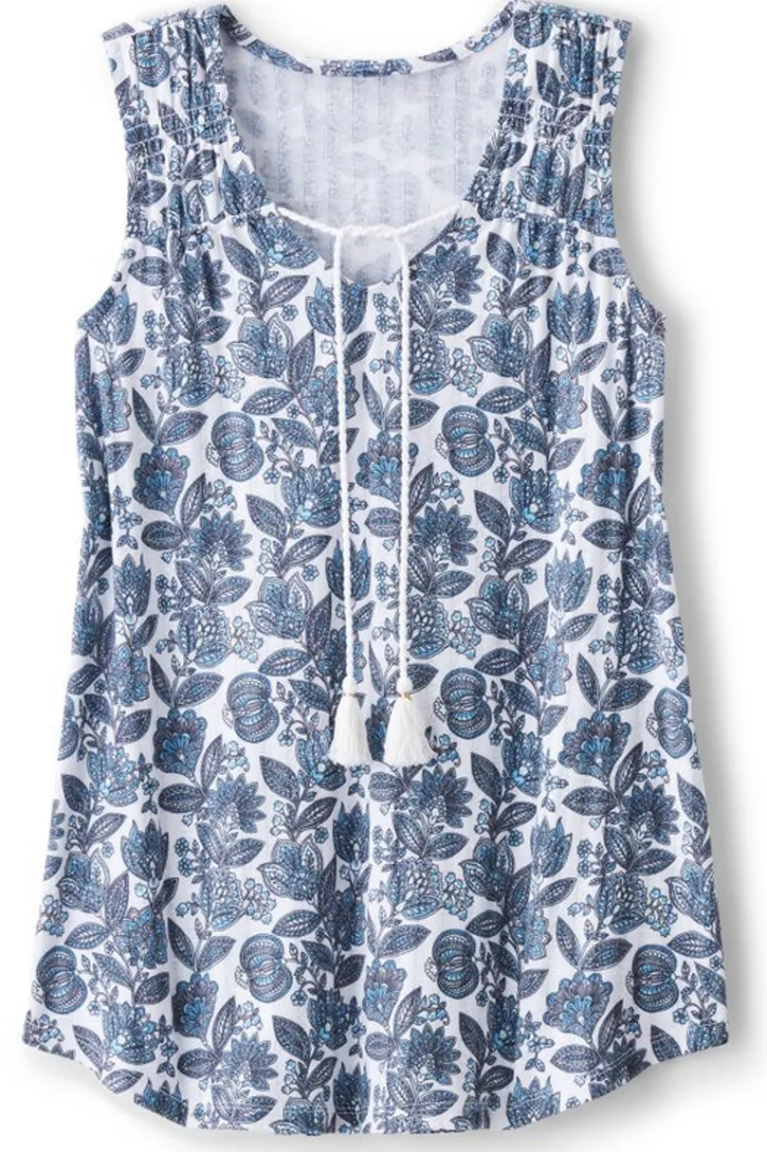 This floral tank boasts a tasseled drawstring at the V-neck, in a textured pointelle knit that’s perfect for warm weather.