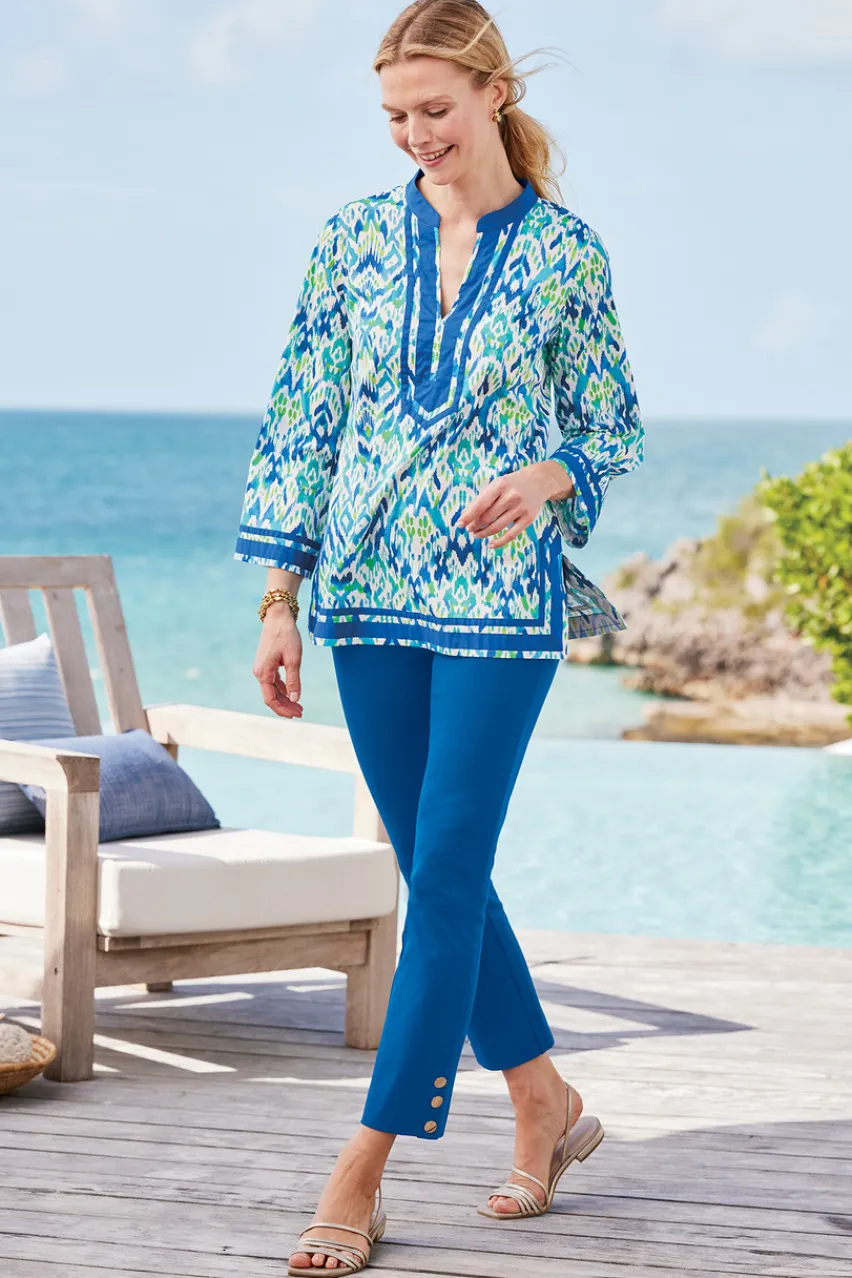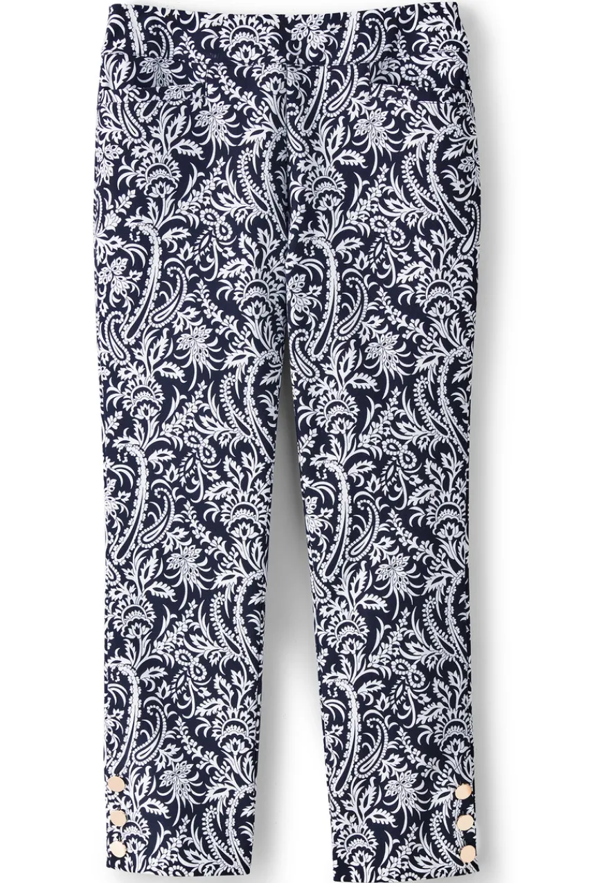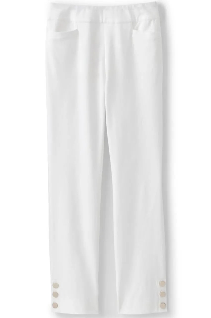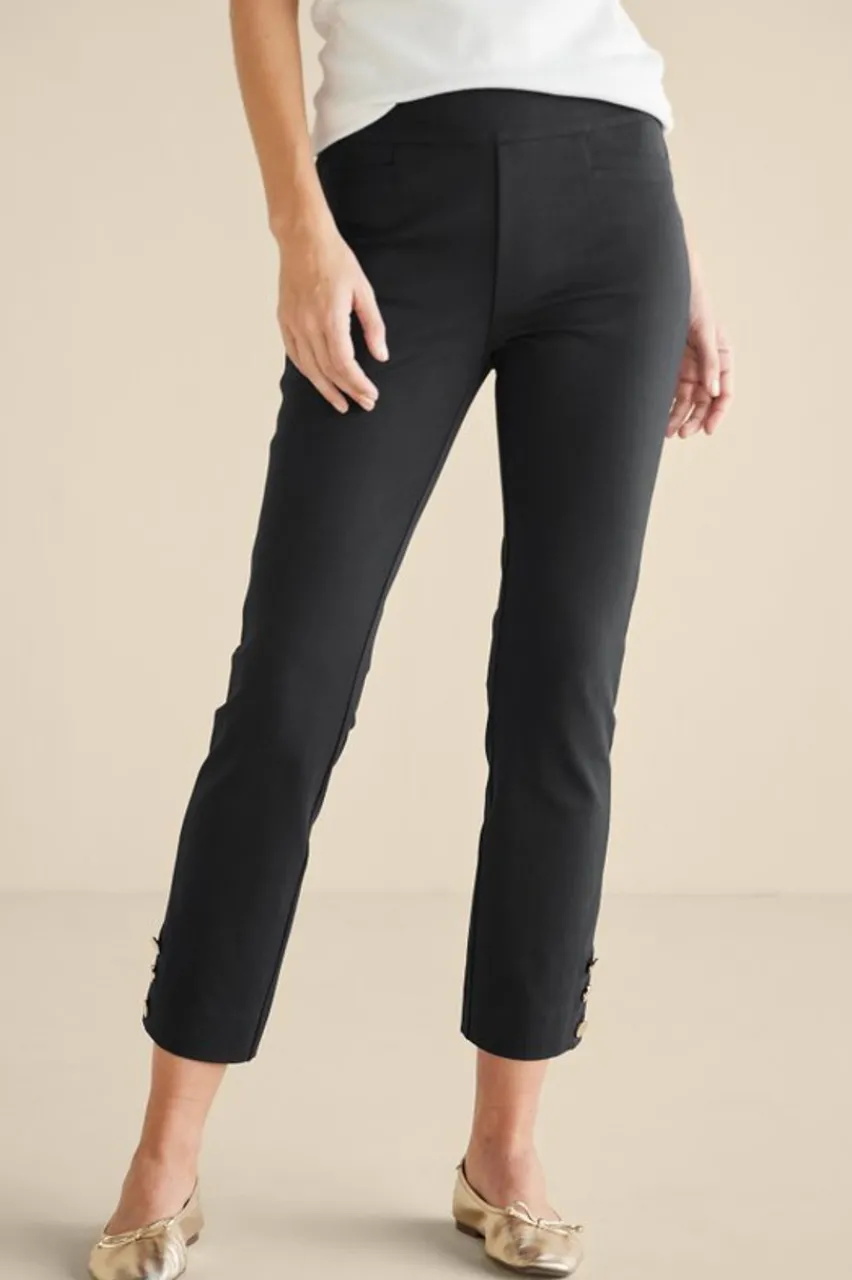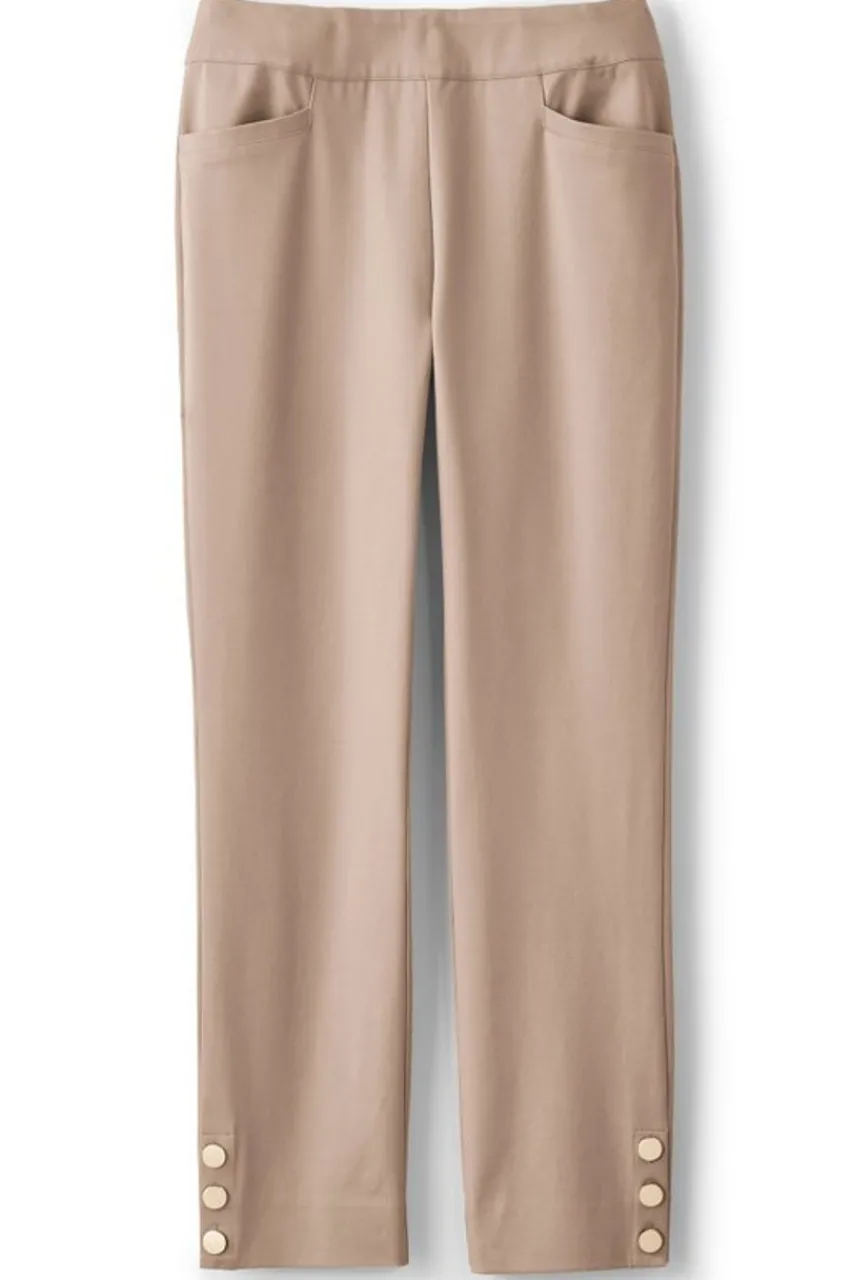 Elegantly finished with gold buttons at the hem, these sleek pull-on crop pants are made from a phenomenal stretch fabric that slims and shapes. A flat, wide waistband and mesh-knit tummy panel combine comfort and subtle shaping. Front J-pockets, decorative back welt pockets. Misses inseam 24.</div>