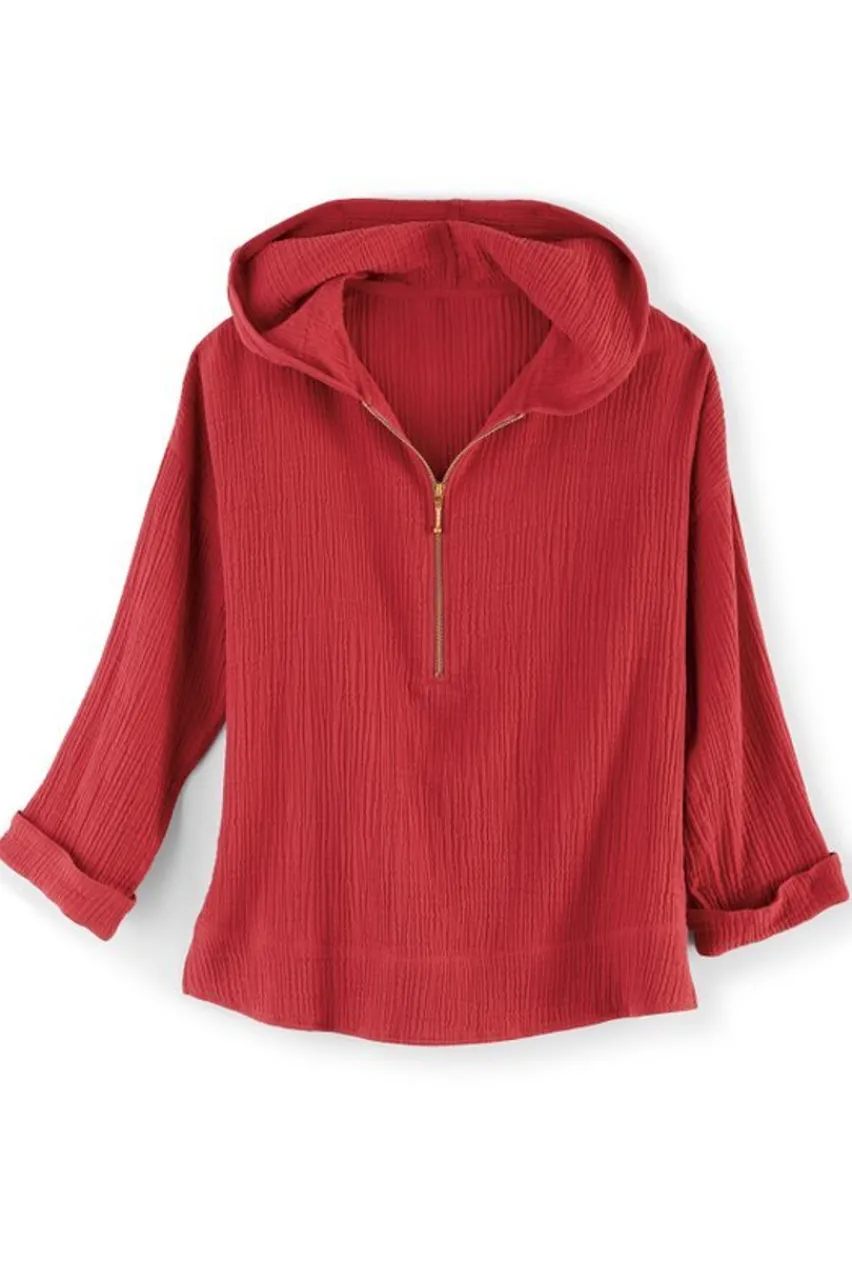 Two greats combine to create this breezy style an easy hoodie and lightweight, airy gauze! A hood, partial zip-front and dropped shoulders define the design.