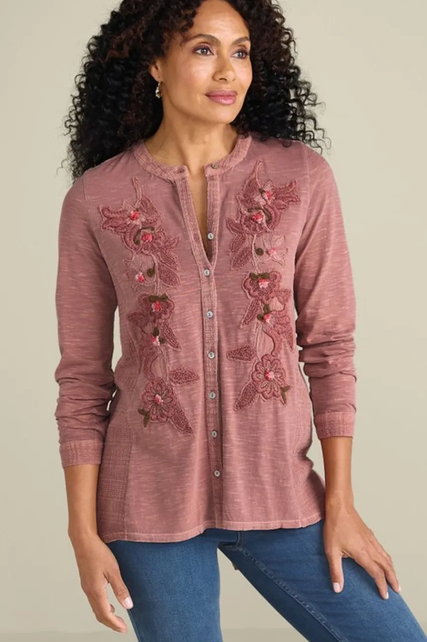 Amazing details update your essential fall top in a lively mix of knit and woven cotton. Embroidered flowers trail down the button front. Shadow stripe defines the back yoke and dramatic, shirttail hem with a deep slit.