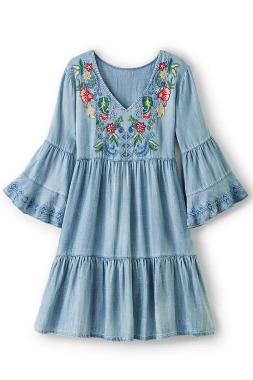 Looks like denim, feels like a dream it’s soft, lightweight and drapey TENCEL™ Lyocell. The flowy, tiered Lina starts with a flattering V-neck that’s accented by colorful floral embroidery. The long sleeves end in a voluminous bell shape with tonal details at the cuffs for even more added pizazz. Bound to be your new favorite casual beauty. TENCEL™ is a trademark of Lenzing AG.