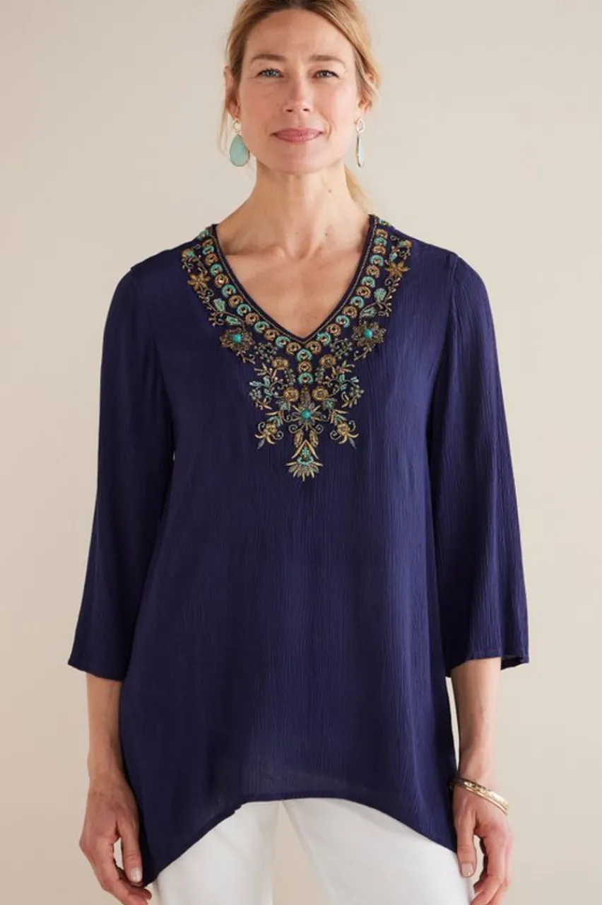 This gauze clebre punches up our favorite warm weather fabric with richcolor and fabulous beading around the V-neck. Sharkbite hem dips at the sides for carefree ease. 3/4 sleeves.