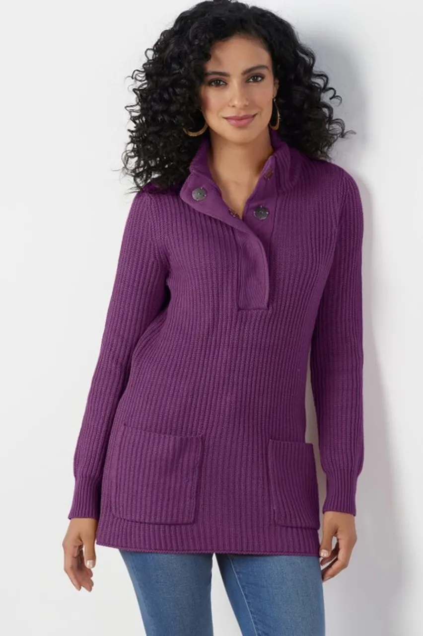 Snuggle up in this soft, chunky rib-knit pullover with modern, fold-over collar, oversized snap placket, and patch pockets. Pairs perfectly with weekend denim.
