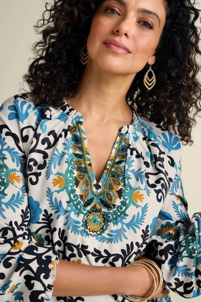 Moroccan-inspired patterns and colors plus Indian-inspired beadwork combine to create this one-of-a-kind artisanal design. While those exclusive embellishments surely caught your eye, take another look to see more details that are sure to please romantic ruffles and voluminous blouson sleeves. So much pizzazz in one top, you’ll want to reach for it on repeat… special occasion or not!