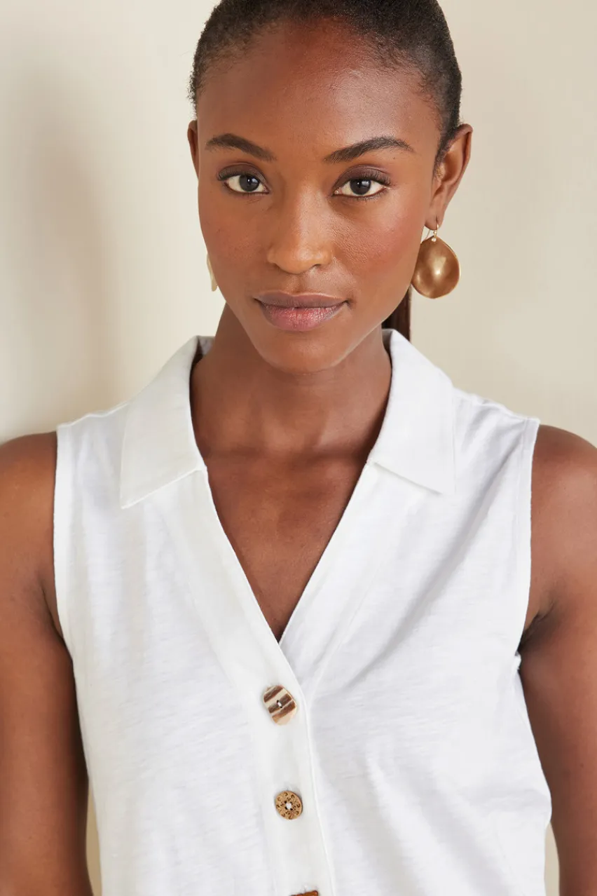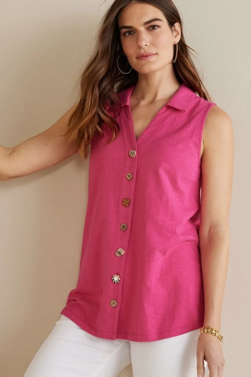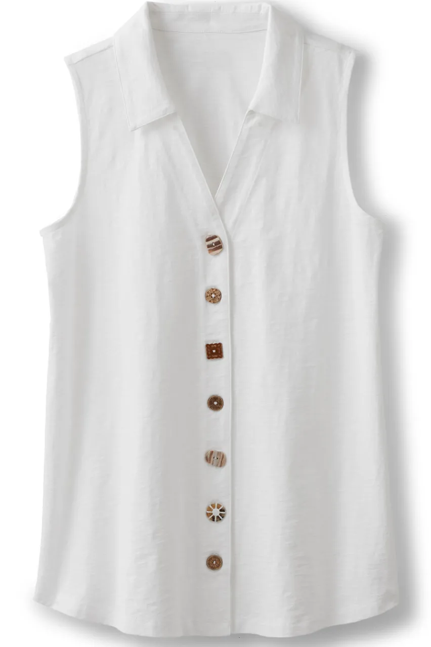 Our beloved Danielle is back and better than ever with an updated silhouette and, of course, the whimsical mix of buttons on the front placket. This flowy, sleeveless tunic is ready for warm weather with a fresh curved hem and high-quality cotton fabric for the comfiest all-day wear.