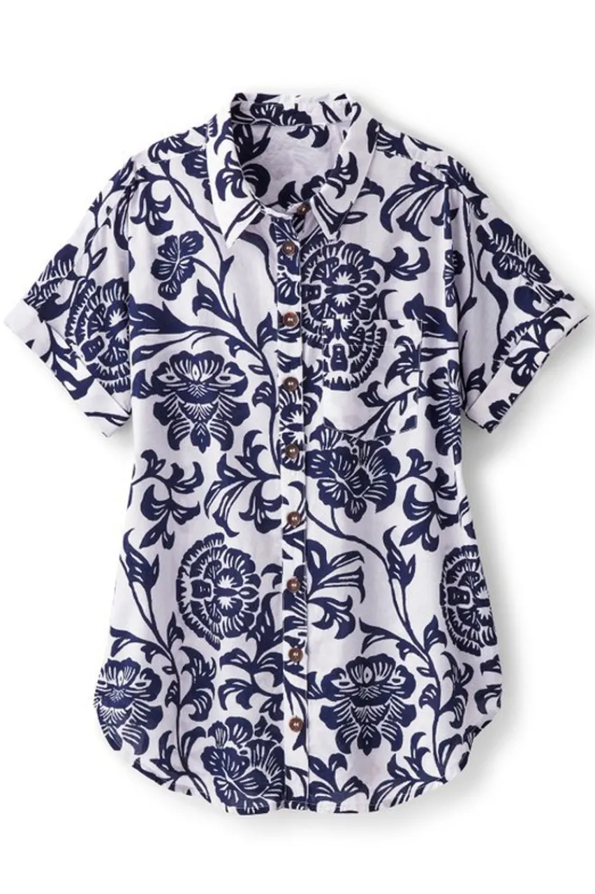 Put it in neutral with this perfectly printed dolman short-sleeve top. Made of soft and comfortable drapey cotton blend, with traditional shirting details like a collar, button placket, chest pocket and curved hem. Dress it up with chinos and heels or dress it down with shorts and sandals. Also in a matching skirt to wear as a set! 2GJ15