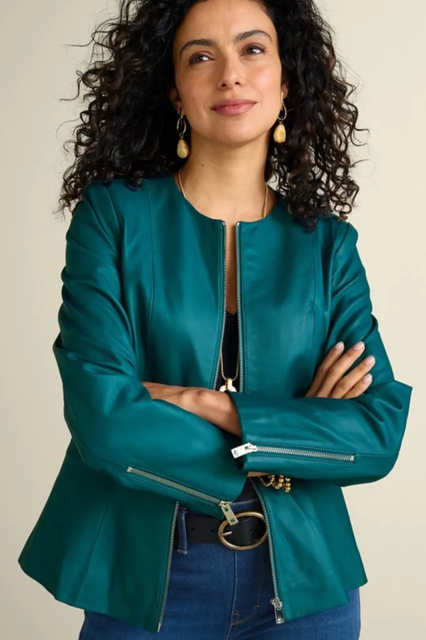 A genuine leather jacket in a fabulous color and an ultra-feminine fit. Its scoop neckline, princess seams and peplum waist endlessly flatter. Its full-zip front and zippered sleeves are endlessly versatile. You’ll want to wear it everywhere for years to come and you can! Lined.