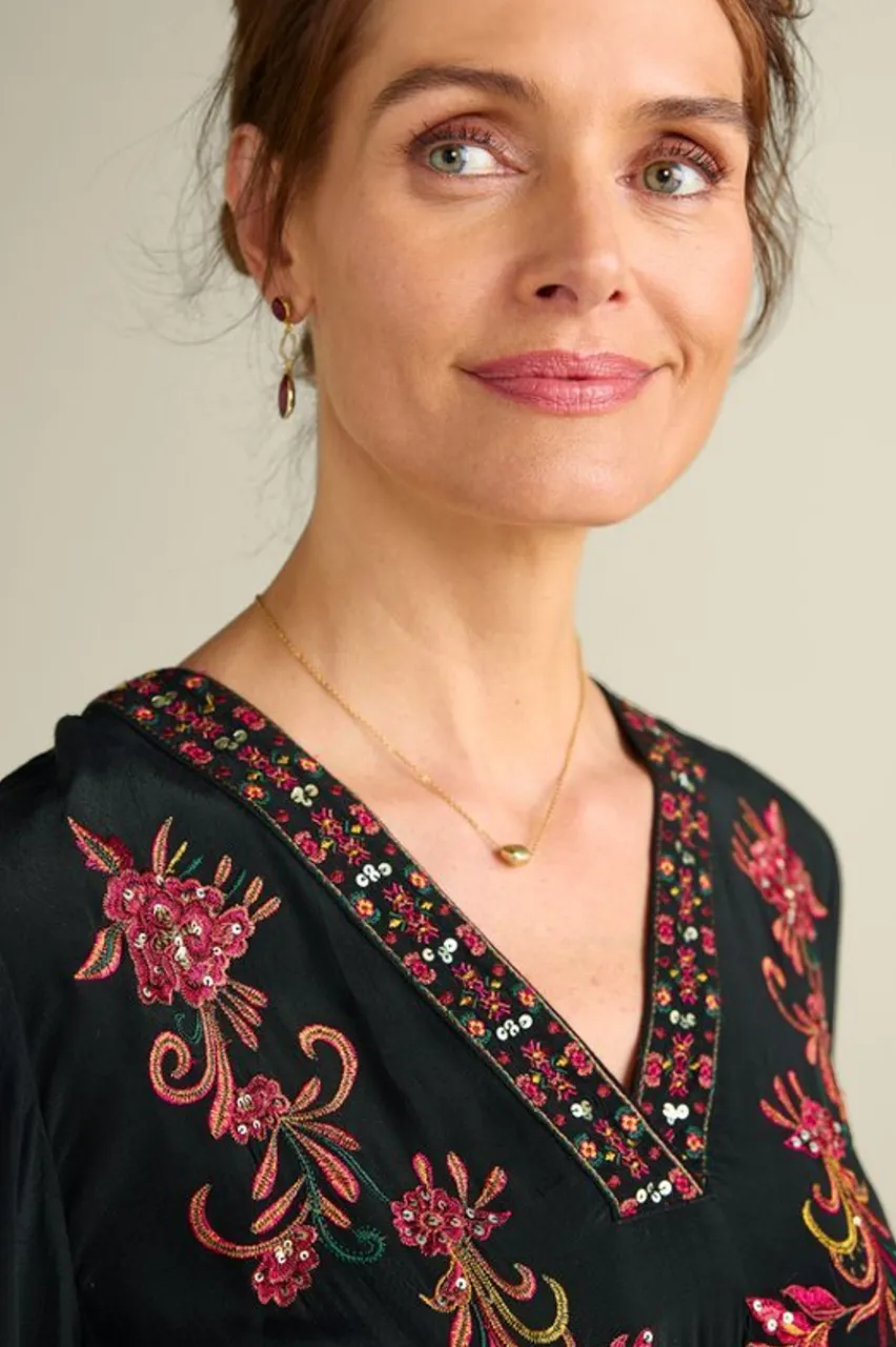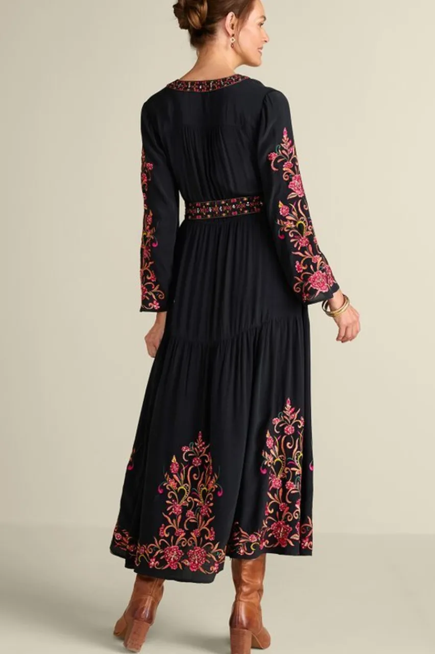 Host and toast in extraordinary elegance. Allover beadwork and embroidery pop off floaty, celebration-ready crepe while the tie belt and elastic waist softly shape and make for a striking figure. Pockets add to the charm of this tiered silhouette.