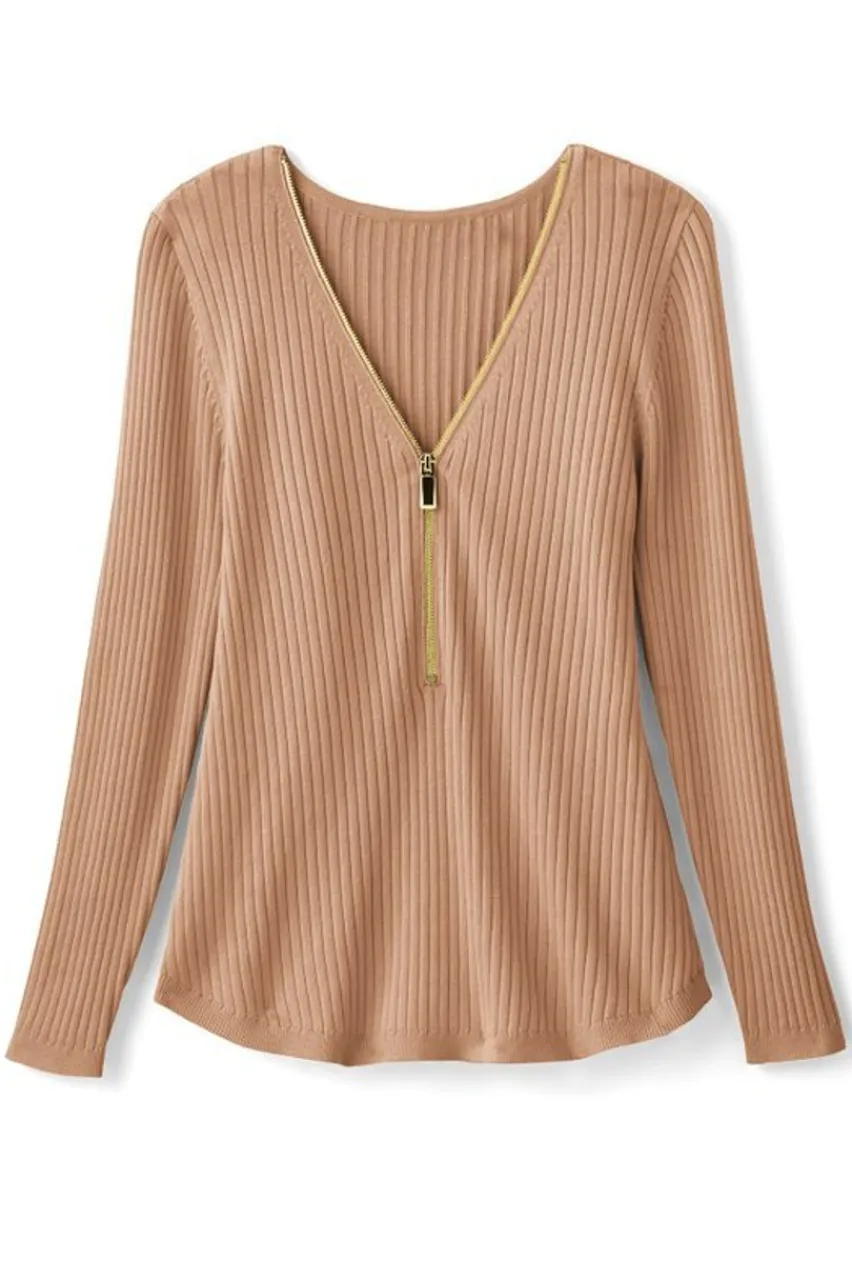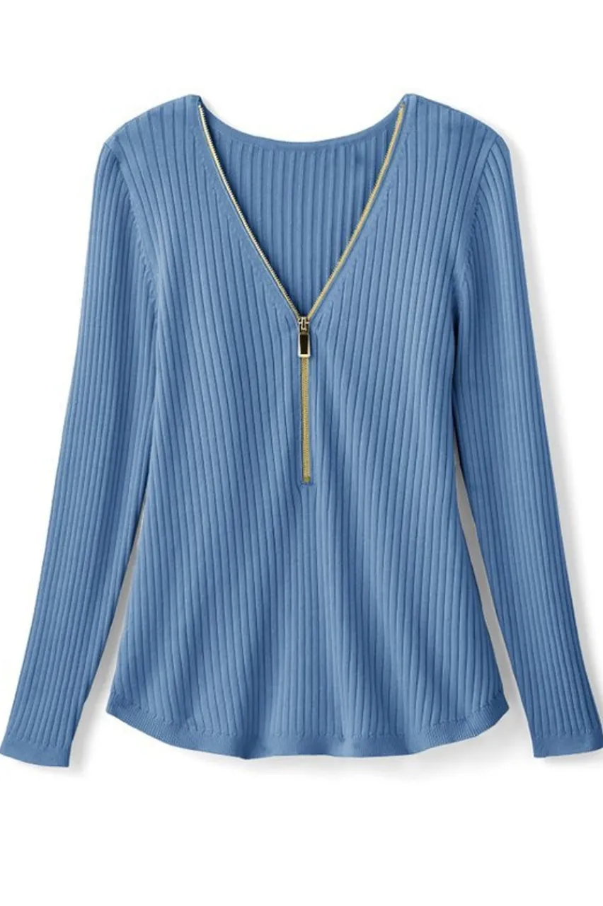 You love this Valentina silhouette. It’s easy and the 3/4 zip with an oversized gold pull adds a brilliant flash of shine at the V-neck. We’ve updated the fabric for a fresh and fabulous new look and amazing feel. The ribbed knit is super soft and polished with a supple inner placket for maximum comfort. Long sleeves, curved hem.
